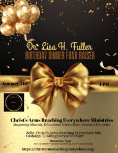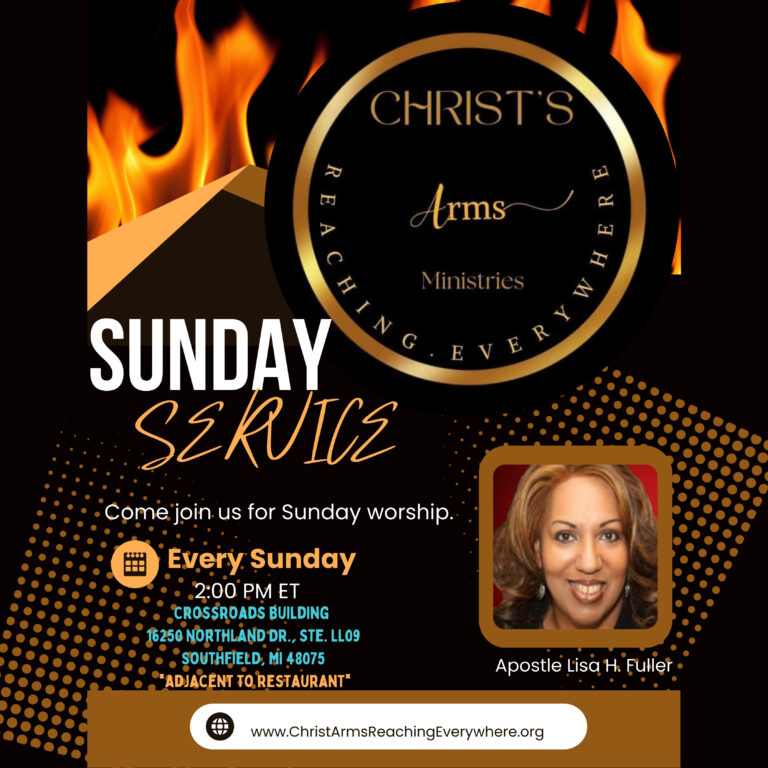 EVENTS JANUARY 2026 WORSHIP SERVICE Sundays 2 PM 16250 Northland Drive * Suite LL09Southfield, MI 48075 CORPORATE PRAYER January 8th-January 29thThursdays 7-7:30 PM Zoom Meeting ID: 865 3885 0679Passcode: 788228Phone: 312-626-6799 USPhone: 646-558-8656 US NO BIBLE STUDYDecember 25th-January 30thResume February 5th Thursdays 7 PM NEW BOOK Missions Minded Managing Anxiety While Serving Managing anxiety while serving in ministry. January 9th JLE Middle Ground Live Facebook & YouTube Grief DiscussionJanuary 17thSaturday 2 PM Zoom Meeting ID: 818 9829 1731Passcode: 314484 Virtual Chaplain TrainingRapid Response Chaplain CorpsJanuary 23rdFriday 10 AM Zoom Meeting ID: 847 5479 5969Passcode: p1rLsS Dr. Lisa’s Birthday Ministry Fund Raiser January 31st * Saturday 4 PM 16250 Northland Drive * Suite LL09Southfield, MI 48075 FEBRUARY 2026 WORSHIP SERVICE Sundays 2 PM 16250 Northland Drive * Suite LL09Southfield, MI 48075 BIBLE STUDY Thursdays 7 PM Zoom Meeting ID: 865 3885 0679Passcode: 788228Phone: 312-626-6799 USPhone: 646-558-8656 US APRIL 2026 Spiritual Warfare Inner Healing & Deliverance Seminar Saturday April 25th 1st —9 AM Information TBA Closer to Date Home Ministries Bible Study Intercessory Prayer Community Ministry International Ministry Broadcast About Us Mission & Vision What We Believe Dr. Lisa H Fuller Encouragement Scriptures: God’s Protection Scriptures: God’s Comfort for You New Beginning Prayer Request/ Contact Us Location Archives 2023 Overview Speaking Request C.A.R.E.ing Partners Events JOIN — Become Family Donate